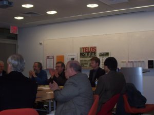The Telos conference, held in the beautiful Puck building at NYU. Adrian Pabst in the center, back, with Ernie Sternberg to his right.