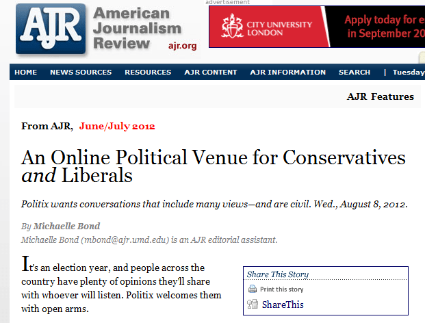 The headline represents the aspirations of Politix more so than it does reality, because our readers, or at least full-time commenters, appear to be overwhelmingly conservative. This is no doubt due to the red state rural and suburban user base that make up Topix, from which most of our users are drawn.
