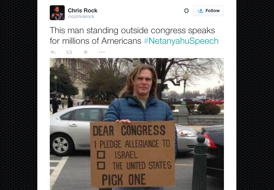 This tweet from Chris Rock shows that the “dual loyalty” crowd doesn’t just encompass gold bugs and fans of Alex Jones. It’ll be interesting to see if and when the somewhat esoteric issue of US support for Israel becomes a big deal for the typical American (or what Mencken derisively referred to as the “booboisie”), for whom celebrity opinion matters much.