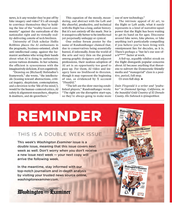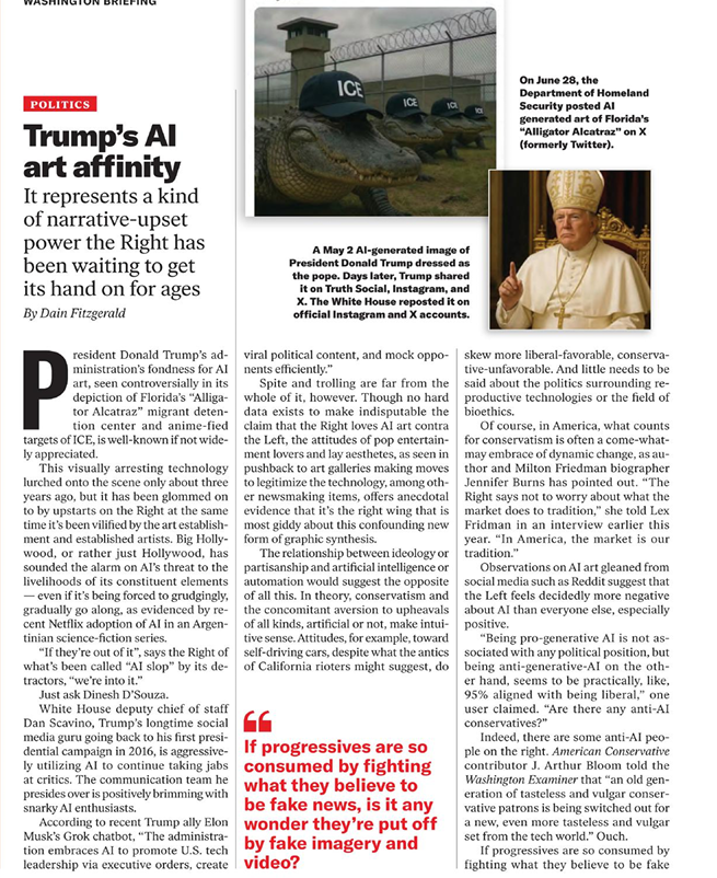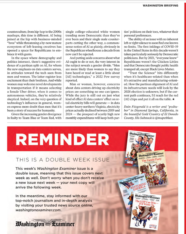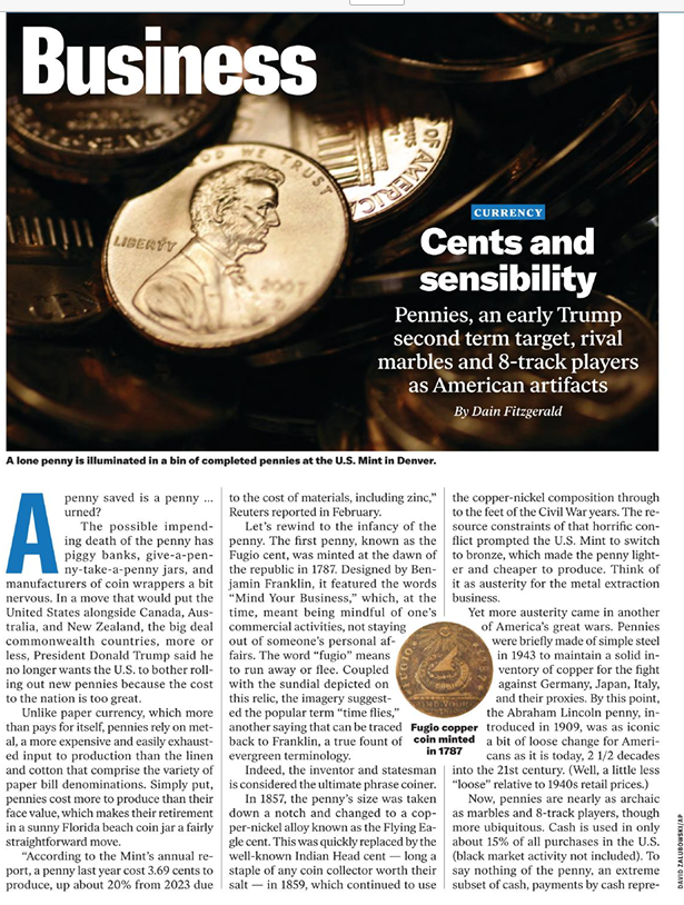 Posted on March 6, 2026March 7, 2026 by Dain Fitzgerald In lieu of linking to paywalled pieces, I’ll post PDF screenshots from the magazine’s print format: 1. Pennies, an early Trump second term target, rival marbles and 8-track players as American artifacts 2. Tech shifts right, somewhat, but minus the Old Guard’s views on trade 3. San Jose mayor cast out as apostate by fellow Democrats over policies popular with the public 4. Trump’s AI art affinity 5. On homelessness and crime, modern-day progressives make 20th-century communists look like grownups 6. AI data centers spur anger across the political spectrum 7. Thuning down the heat: The turn away from climate change alarmism Share this: Share on X (Opens in new window) X Share on Facebook (Opens in new window) Facebook Like Loading...